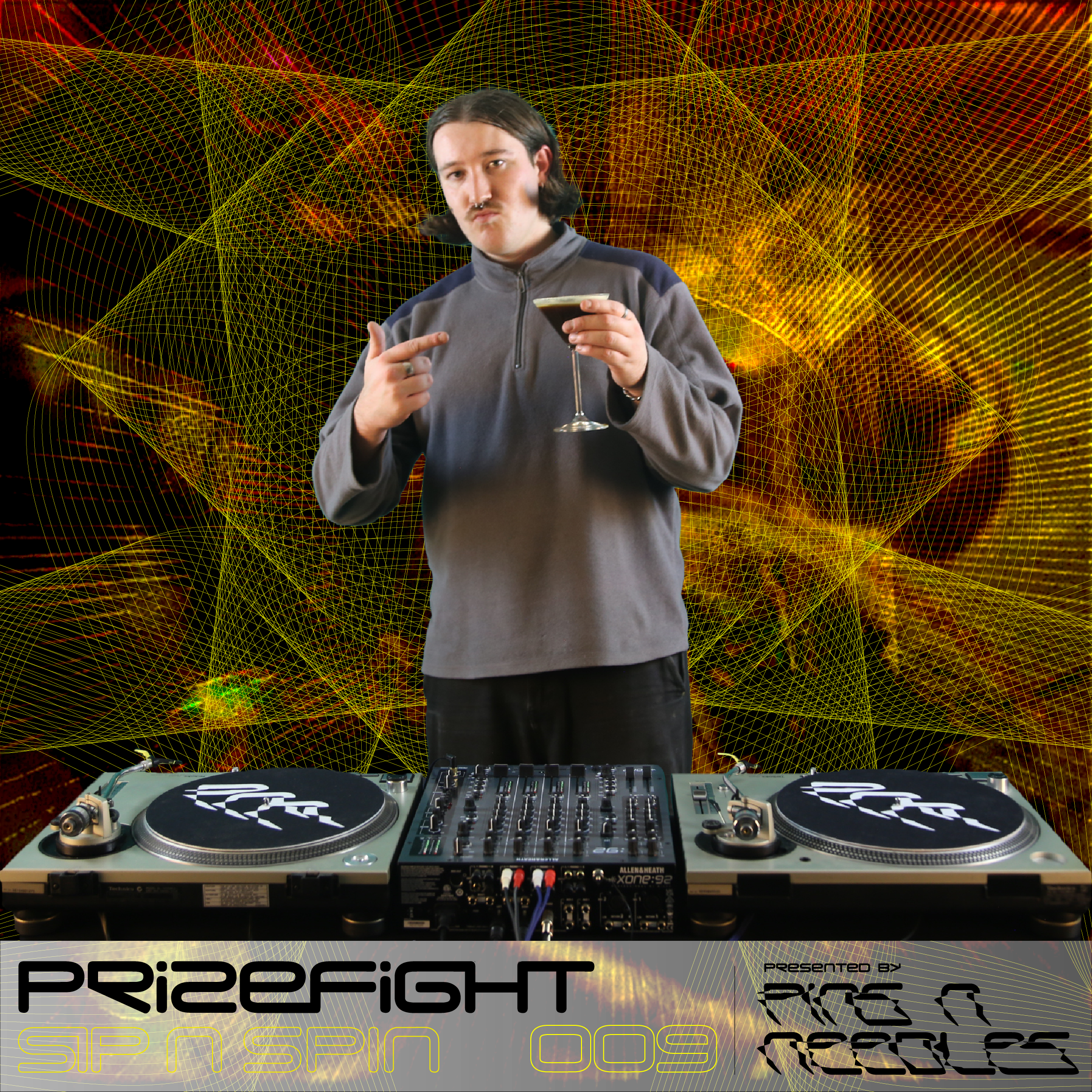 I have also created a typeface to service Pins n’ Needles media that is inspired by the Skins compression wear logo. The typeface is used in promotional content on social media as well as print advertising for events and Sip n’ Spins. The typeface is sleek with all letters being the same height to give a fast and futuristic aesthetic. For artists Sip n’ Spin artwork (above) I have taken snaps of their musical influences and layered them on top of one another, colour treated them and placed line graphics over the top, resulting in a netting like effect, another graphic element that has become a staple in the collectives branding.